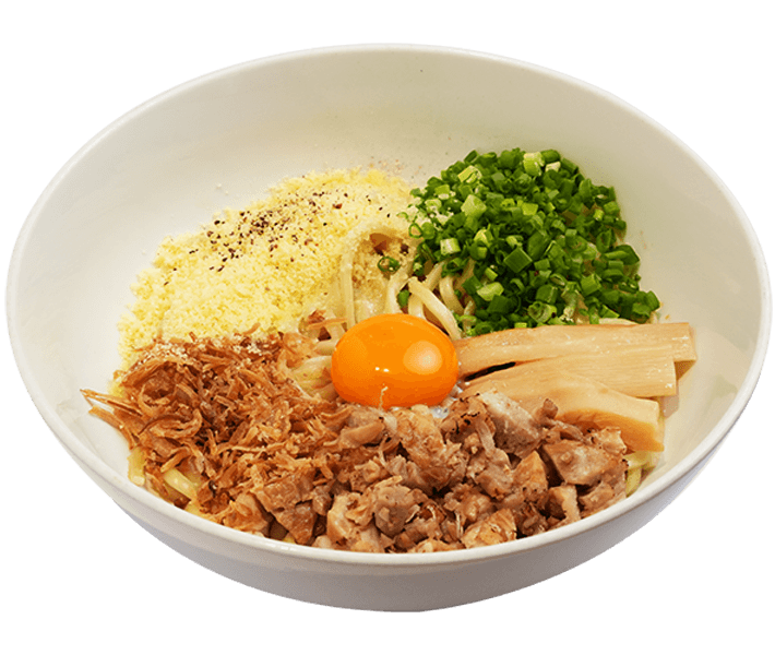 Soupless Ramen, Topped with shredded chashu, spring onion, bamboo shoot, fried onion, parmesan cheese and egg yolk or onsen egg.