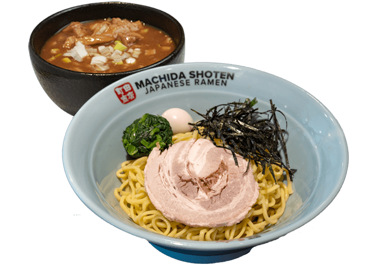 Dipping Style Ramen, Served with cold noodles, topped with a piece of chashu, spinach, quail egg and shredded nori.