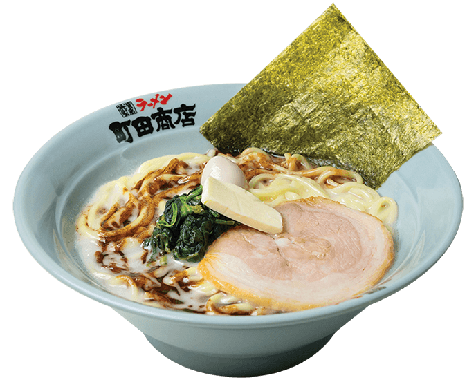 Topped with a piece of chashu, spinach, quail egg, a slice of butter, black garlic oil and nori.