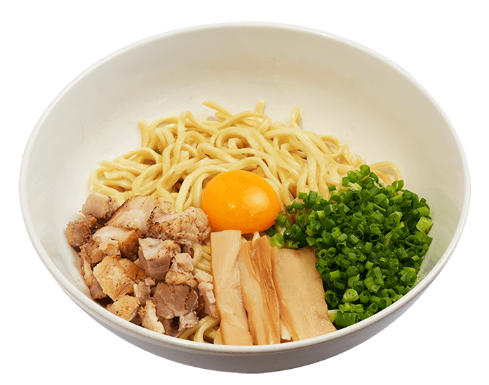 Soupless Ramen, Topped with shredded chashu, spring onion, bamboo shoot, and egg yolk or onsen egg.